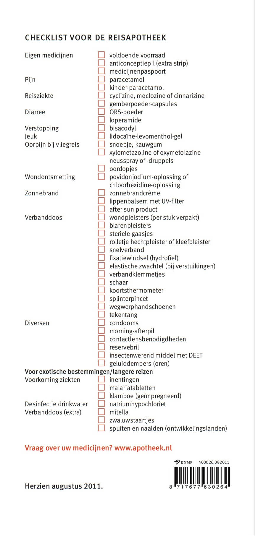 Op vakantie of op reis voor het werk? Naar Nepal, Nice of zonnig Zoutelande? U wilt plezierig uit en gezond weer naar huis. Als het gaat om uw medicijnen, het bewaren van medicijnen onderweg, risico’s, kwaaltjes en ongemakken, geeft uw apotheker u graag advies. En als geheugensteuntje: een checklist voor de reisapotheek.
